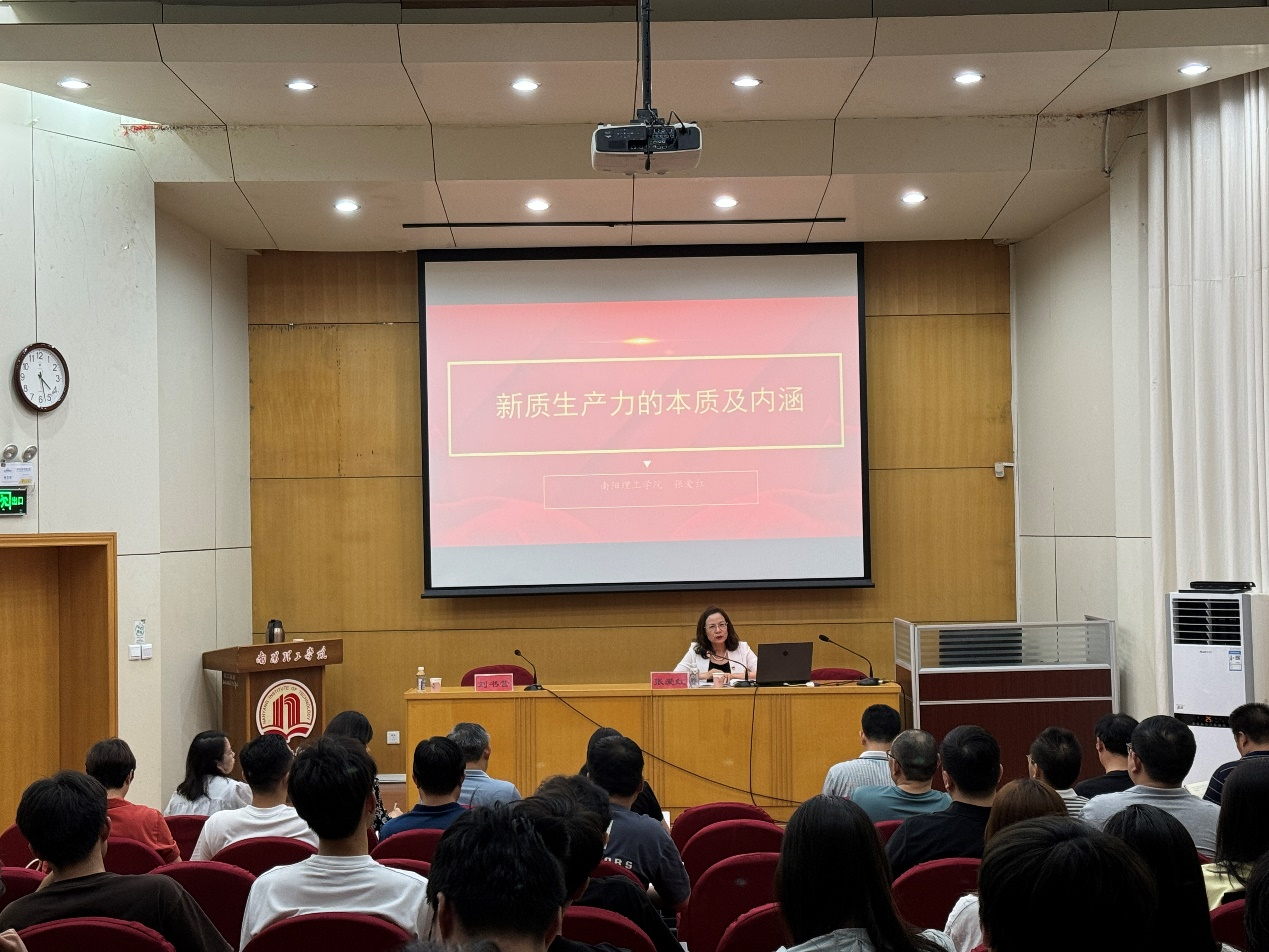 张爱红以《以“新质生产力的本质及内涵”》为题,围绕“新质生产力”的源起、“新质生产力”提出的国际国内背景分析、“新质生产力”的基本内涵、高校在发展新质生产力中的职责和作用等四个方面进行了详细的解读和阐释,和大家深入交流了自己的认识和体会。