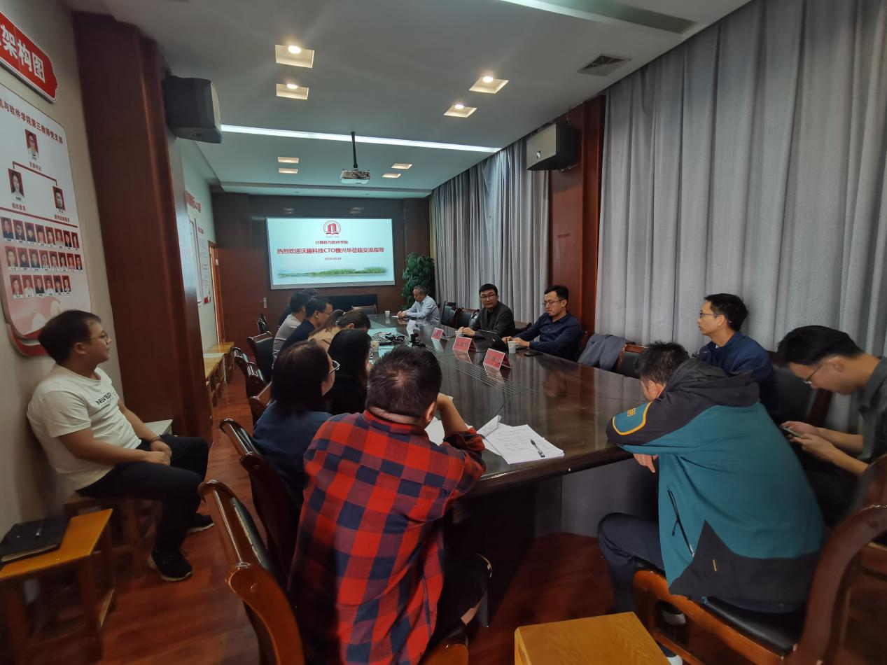 本网讯(特约记者/刘伟)10月18日上午10时,杭州沃趣科技股份有限公司首席技术官(CTO)魏兴华一行莅临356体育在线官网交流指导。公司党委书记赵东江、教学副经理郭东恩、各教研室主任和核心教师代表参加了座谈会。