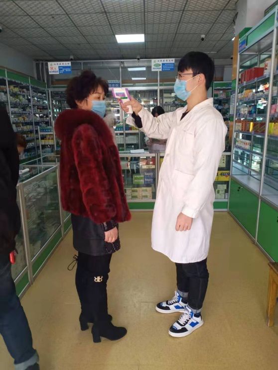 18级渗透测试1班的王澍雨在青海省西宁市湟中县多巴镇佳农医药连锁康容第四药店做志愿者,帮买药者量体温。