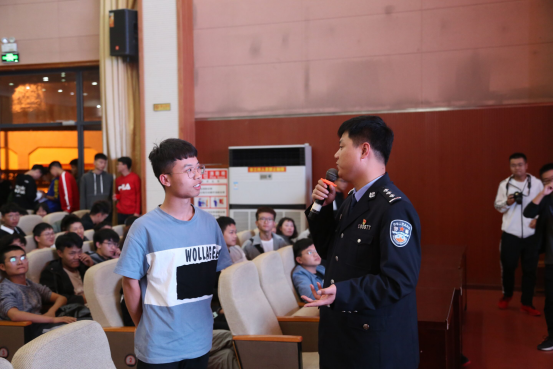 接着南阳市公安局付聪警官以日常生活中经典的财产、安全、健康选择题为例,引入了有关电信诈骗的潜在危害。付警官从警11年,参与侦破社会影响较大案件100余起,他以电信诈骗的高科技性、流动性、多样性等特性,对当下社会骗子行骗的手段以及作案特点进行了全面剖析。他以特殊案件为例,穿插现场互动交流,生动有趣的将反电信诈骗的知识引入,给同学们上了一堂丰富多彩的防诈骗课程。最后以推行公众号“终结诈骗”的形式,给同学们未来防范意识上紧了发条。