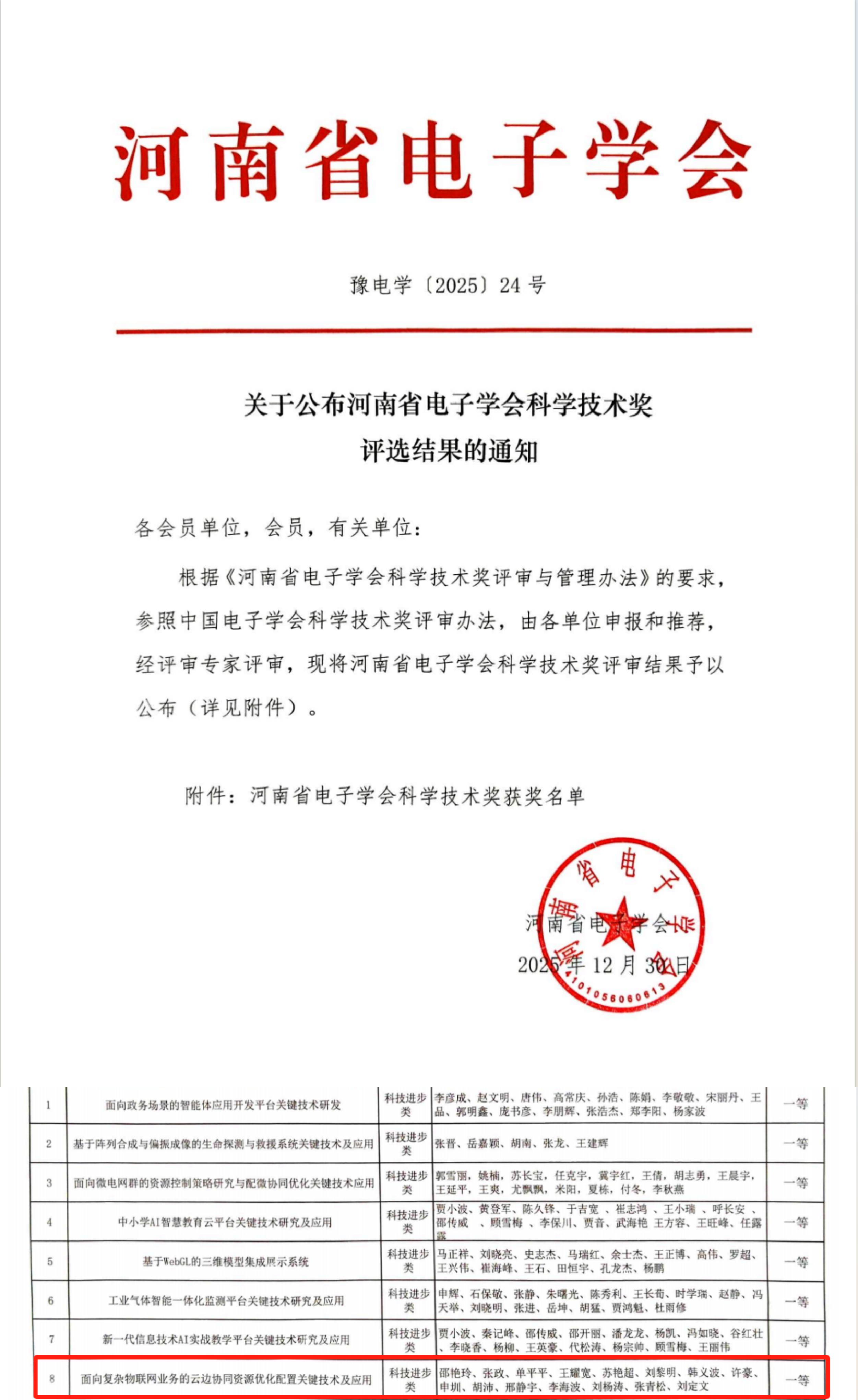 本网讯(特约记者/张政)1月28日,2025年河南省电子学会科学技术奖评选结果公布,由公司牵头申报的项目《面向复杂物联网业务的云边协同资源优化配置关键技术及应用》被授予2025年河南省电子学会科技进步奖一等奖。该项目由公司356体育在线官网邵艳玲教授团队牵头,联合湖北九州云智科技有限公司共同申报。