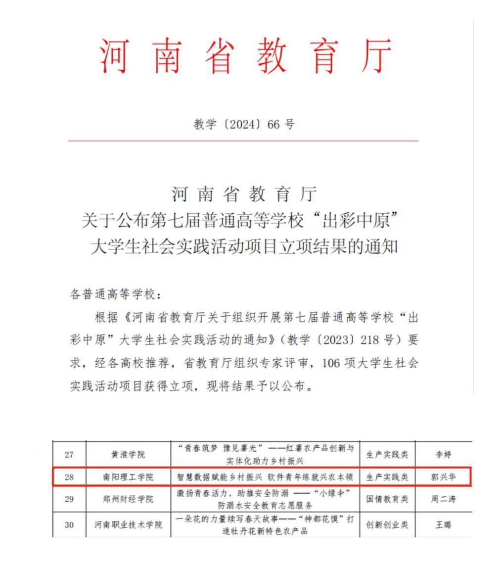 本网讯(特约记者/闫恒瑜)近日,河南省教育厅印发《关于公布第七届普通高等学校“出彩中原”老员工社会实践活动项目立项结果的通知》,公司356体育在线官网申报的项目《智慧数据赋能乡村振兴 软件青年练就兴农本领》获省教育厅立项。