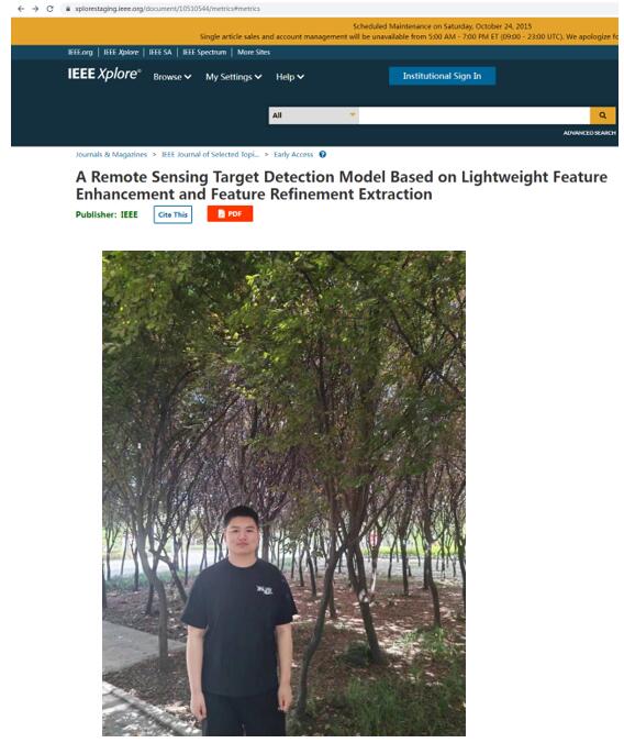 本网讯(员工记者/孙振)近日,公司2021级软件工程专业(智能软件开发方向)员工、校百度菁英班负责人周卓柯同学在中科院SCI二区期刊《IEEE Journal of Selected Topics in Applied Earth Observations and Remote Sensing》(IF=5.5),发表题为“A Remote Sensing Target Detection Model Based on Lightweight Feature Enhancement and Feature Refinement Extraction”的研究论文。该论文在郭东恩教授的精心指导下,成功录用,录用期刊影响因子5.5。