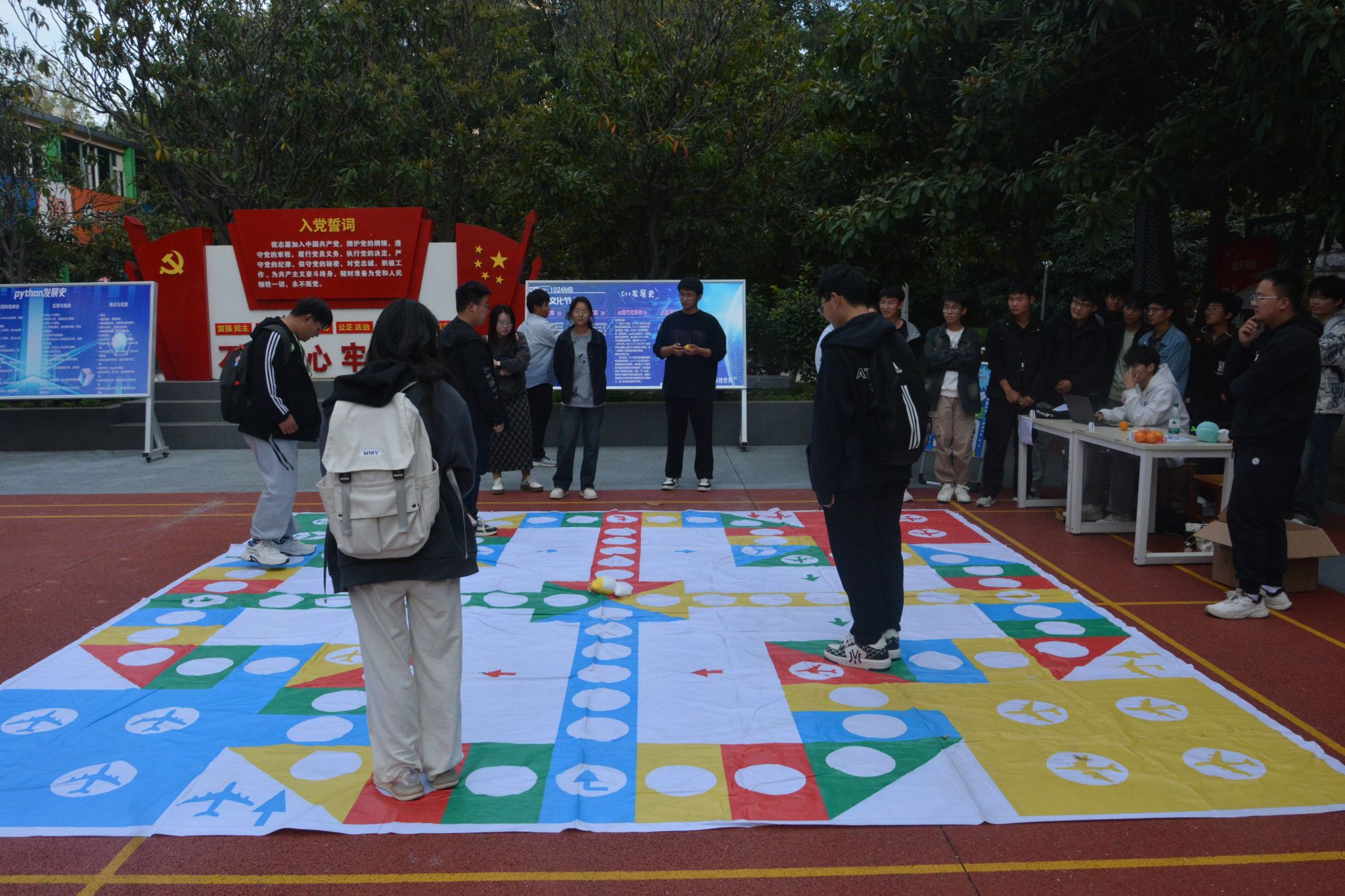 同时,丰富多彩的活动也吸引了众多同学的积极参与。“10.24 秒挑战”紧张刺激。每人拥有两次机会,参赛者需按到 10.24 秒,误差在 0.06 秒之内即为挑战成功。这个挑战考验着参赛者的反应速度和精准度,绝大多数挑战成功的人都会有误差,但现场竟出现了精准按到10.24秒的同学,可谓幸运加倍。“心想事‘橙’”充满趣味。参赛者站在规定的线后套橙子,每人一次机会,五个圈中套中三个橙子可兑换小礼品一个,套中两个则能获得橙子一个。套圈需完整落地,同学们全神贯注,瞄准目标,引得周围更多人驻足围观。“横扫 Bug”精彩连连。一排两瓶矿泉水,参赛者在规定线后扔沙包,每人一次参加机会,可扔三次,打倒两次即可兑换小礼品一份。这个活动仿佛是程序员们在日常工作中扫除 Bug 的缩影,大家斗志昂扬,争取一举成功。“人体飞行棋”别出心裁。参与者需用 dev c/c++在 40s 内打出随机数(范围[0,4])并成功运行,且单次活动人数为 2 至 4 人,率先走完到达终点者获得奖品一份。同学们在这个活动中不仅展示了自己的编程能力,还体验了团队合作的乐趣。 整个活动现场气氛热烈,欢声笑语不断。同学们在参与活动的过程中,不仅收获了小礼品,更重要的是对计算机文化有了更深刻的认识和理解。