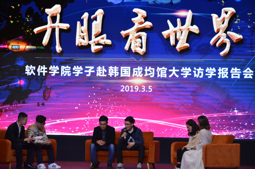 报告会特邀了本次赴韩国成均馆大学访学同学中4名同学作为代表进行报告,他们分别从四个方面就这次访学之旅为同学们做了详细地报告。潘坤同学对他在成均馆大学学习到的前沿技术进行了大致的讲解,提升了同学们的知识视野。周民安偶同学围绕在成均馆大学如何学习及对成均馆的教授和员工的认识展开交流。刘大铭同学向同学们分享了英语原版论文的阅读方法和英语学习方式。已经拿到DataStreams公司offer的袁琴同学围绕参观、学习和生活对这次访学经历进行分享和交流。报告会结束后,主持人邀请四位分享者与现场同学们进行互动答疑,台下的同学积极踊跃通过微信上墙提问方式,围绕他们在韩国的所见所闻,以及对专业英语学习之间的关系等问题进行询问,四位同学耐心的为大家进行交流和解答。