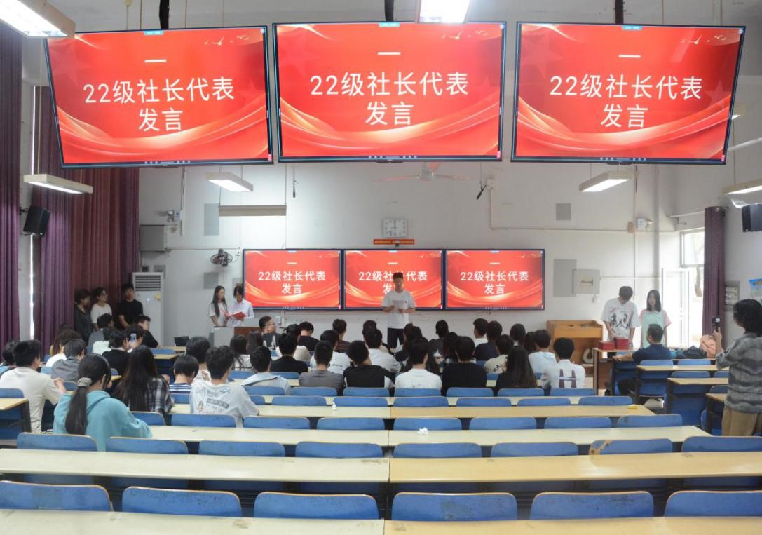 在观众的热烈掌声中,聘任仪式正式拉开帷幕。首先,22级社长代表上台发言。他回顾了担任社长一年来的难忘历程,从组织社团招新,到带领社员参与校级科技竞赛并斩获佳绩,每一段经历都饱含对社团的深厚情感。同时,他也感谢指导老师在活动策划、资源协调等方面给予的帮助,以及每一位社员的付出与支持。最后,他分享了自己在统筹管理、沟通协调中的经验,叮嘱23级新任社长在未来工作中既要坚守社团初心,也要勇于创新突破。