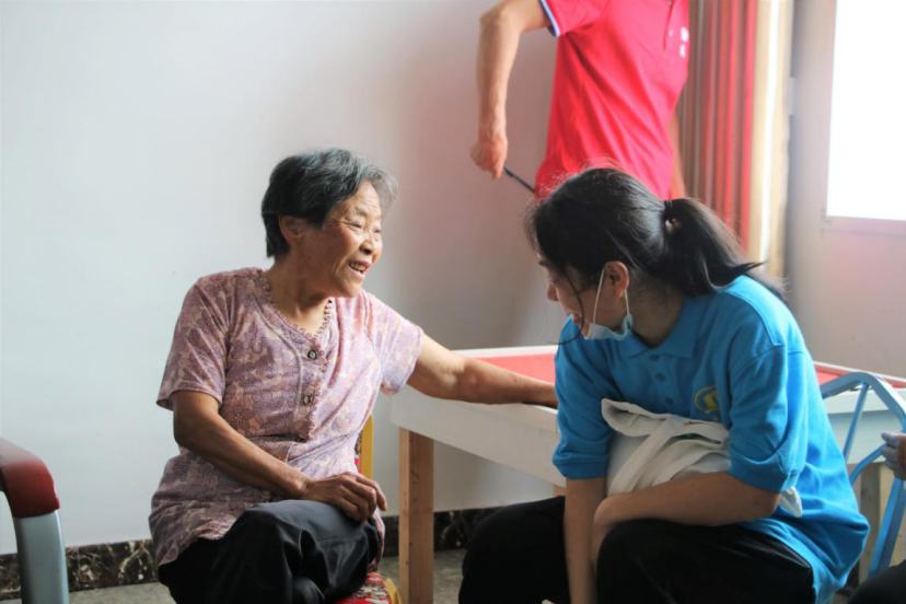 实践队在村干部带领下,带着慰问品到子育村异地搬迁后建起来的幸福大院。这里是子育村实现“脱贫攻坚一个不落”的养老院,住着村里的孤寡老人,队员们陪老人聊天、打牌、做游戏,为他们带去贴心的陪伴和真心的问候,让老人在精神上有所依、有所乐、有所得。