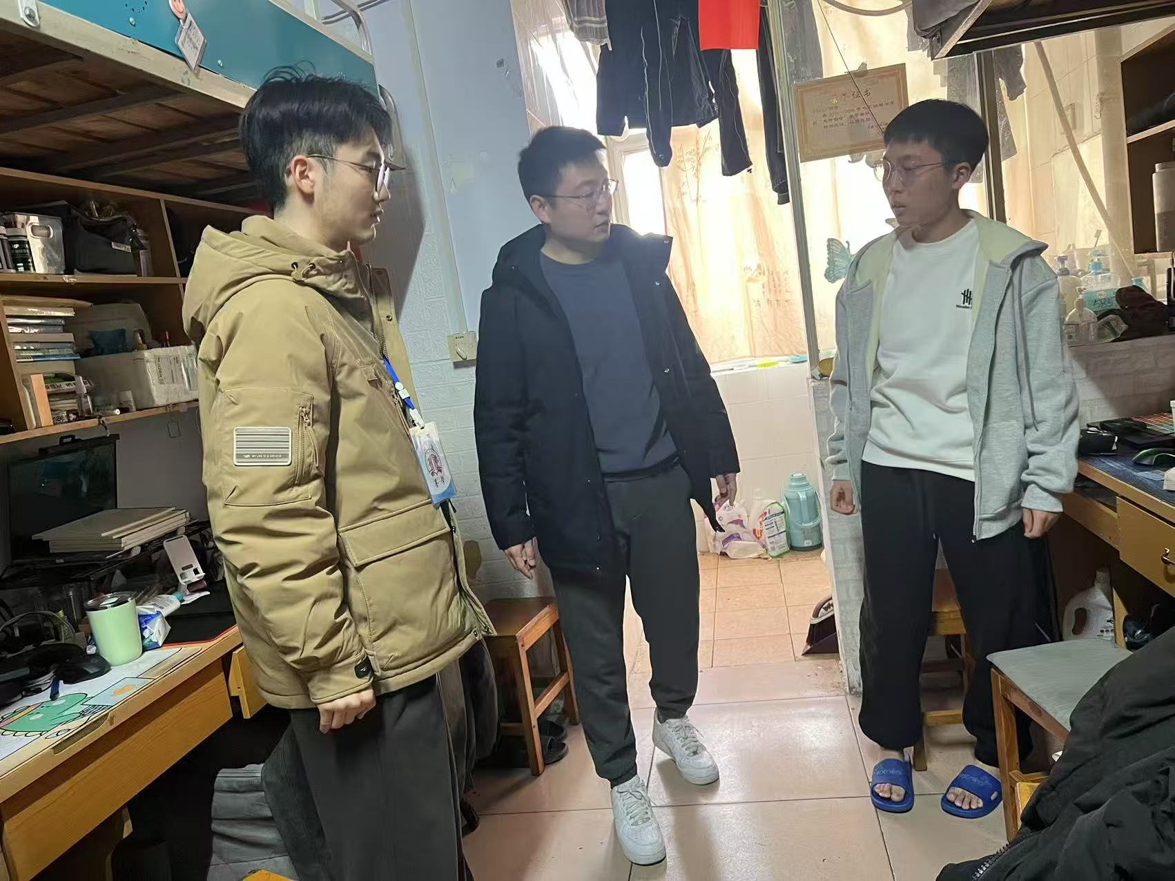在走访宿舍过程中,老师们仔细查看了员工宿舍内务整理、卫生安全以及通风消毒等情况,向同学们传达了春季传染病预防的重要性。老师们还与员工亲切交流,询问大家的学习生活情况,倾听同学们的需求与建议,同时也鼓励员工们勤勤恳恳地学好专业基本知识,扎扎实实地掌握好科研实践操作技能,在此基础上也要切实保证自身作息与饮食规律,劳逸结合,要走出宿舍、走向操场,积极进行体育锻炼。